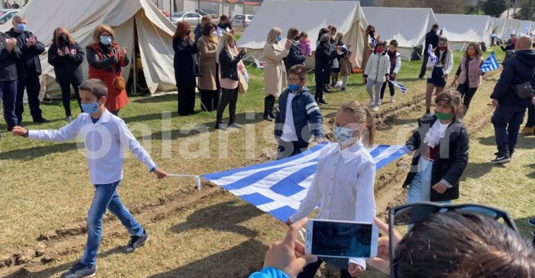 Οι μαθητές πραγματοποίησαν γιορτή για την εθνική επέτειο και στη συνέχεια παρέλασαν δίπλα στις σκηνές εισπράττοντας το θερμό χειροκρότημα από τους παρευρισκόμενους.
